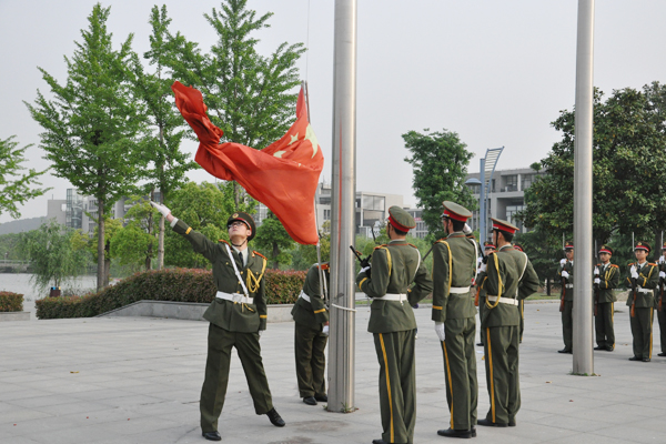 在我校云峰大学生管乐团吹奏的雄壮豪迈的《歌唱祖国》旋律声中,国旗护卫队护卫着国旗健步走入升旗区。在激昂嘹亮的国歌声中,全体师生注视着五星红旗徐徐升起。
