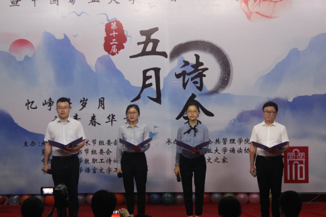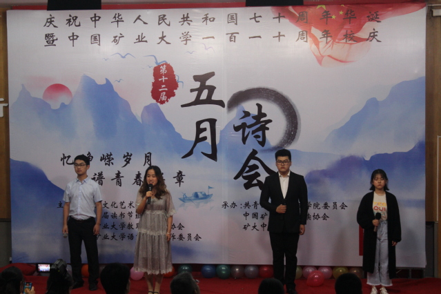 为献礼新中国70周年华诞、矿大110周年校庆,5月18日,由大学生文化艺术节组委会、第十八届读书节组委会、中国矿业大学语言文字工作委员会、教职工诗词协会主办,共青团公共管理学院委员会、中国矿业大学诵读协会和矿大中文之家共同承办的第十二届五月诗会汇报演出于镜湖大讲堂举行。
