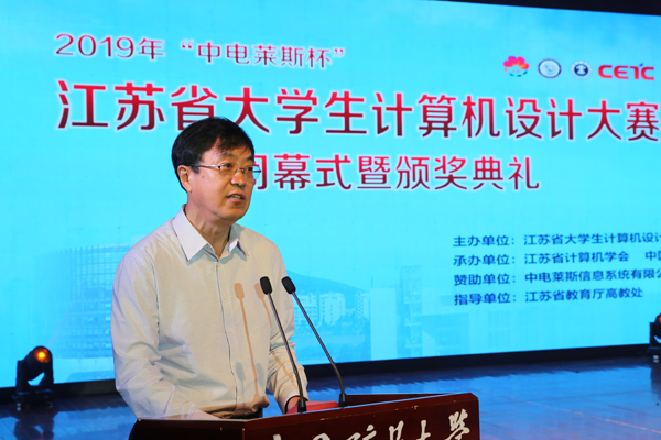 邵进处长致辞。他表示在建设网络强国、数字中国、智慧社会的背景下,培养大批具有创新能力和合作精神的高端人才,是教育的重要使命。江苏省高度重视计算机与信息技术领域的人才培养,不断深化教育教学改革,提升学生综合素养和应用创新能力。希望以此平台发现优秀作品,发掘高质人才,为推动“强富美高”新江苏更高质量发展作出新的更大贡献。