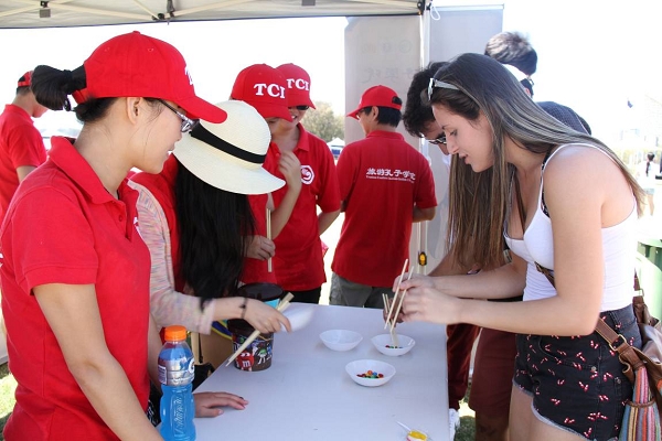 活动过程中,旅游孔子学院在专属展位精心布置了一个充满中国传统文化特色的“小舞台”。大红的中国结和各式传统窗花剪纸交相辉映,装点在舞台和展台上;中国汉字文化和游戏吸引过往的观众驻足观看并积极参与;为外国友人取中文名并用毛笔写中文名书签的活动一如既往地受到男女老幼的欢迎;工作人员详细地为游客们解说孔子学院的各色文化课程和文化项目,派发宣传单,游客们纷纷咨询自己感兴趣的中国语言与传统文化课程。