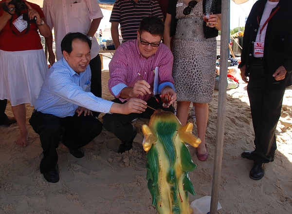 中国驻布里斯班总领馆赵永琛总领事和昆士兰州议员Rob Molhoek为旅游孔子学院龙舟点睛