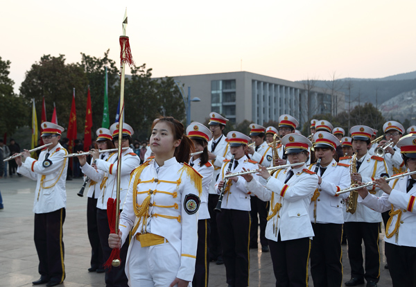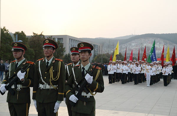 上午7:00,在云峰大学生管乐团演奏的激昂的《歌唱祖国》的乐曲声中,国旗护卫队护卫国旗健步进入升旗区。在雄壮的《国歌》声中,五星红旗冉冉升起。随后,中国矿业大学校旗在《中国矿业大学校歌》悠扬的旋律中升起在国旗广场上空。