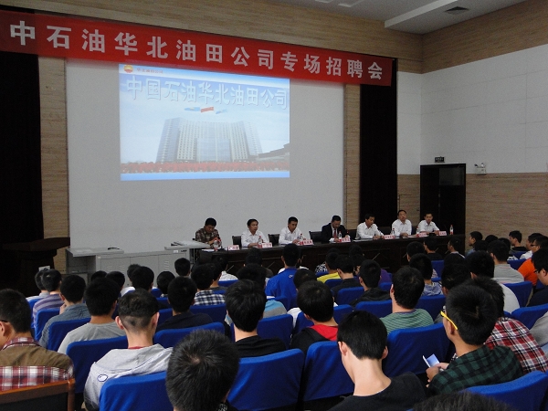 洽谈会后,在机电学院B110报告厅召开了中石油华北油田公司专场招聘会,学生工作处副处长胡卫新主持招聘会。赵贤正副总经理面向学校2013届毕业生进行了招聘宣讲,经过现场接收求职简历、面试等环节,最终有7名毕业生与华北油田签订就业意向协议。