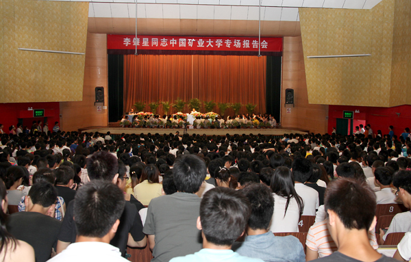 25日上午,文昌校区科学馆座无虚席,主席台上也尽是盘腿而坐的学生,全校1500多名学生代表及部分教师参加了李肇星同志中国矿业大学专场报告会。报告会由校党委书记邹放鸣主持,历时2个多小时。李肇星同志的睿智幽默令在场矿大学子深深折服,演讲多次被热烈的掌声打断。