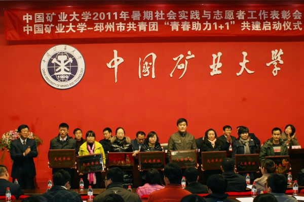 校党委副书记、纪委书记曹德欣,共青团徐州市委书记张克,邳州市委常委、组织部长苏伟,邳州市团市委书记孙鑫,校党委宣传部部长、校团委书记熊志忠,教务处副处长管红杰,学生工作处副处长蒋敏出席仪式。会议由校团委副书记李江涛主持。学校各学院团委书记、邳州市各乡镇团委负责人、受表彰的先进集体和个人代表参加了会议。 校党委副书记、纪委书记曹德欣代表学校党委和行政向前来参加此次活动的领导和共青团干部们表示热烈的欢迎,对共建活动的正式启动和此次受表彰的各类先进集体和个人表示热烈的祝贺。他在讲话中指出,高校是培养社会发展所需人才的重要平台,高校在人才培养的过程中为青年学生的综合素质提升提供良好的环境和广阔的空间,会在很大程度上影响人才培养的质量。而在青年学生综合素质拓展的过程中,实践能力是决定其所学所知能否有效地转化为所行所为,从而推动社会发展的核心素质。他以《中庸》中关于“博学、审问、慎思、明辨、笃行”的学习方法的论述入题,深入浅出地解析了大学生参加社会实践活动对其自身的成长成才所能够产生的重要影响。他还结合高校人才培养与地方经济社会发展之间的关系,充分肯定了此次校地“青春助力1+ 曹德欣副书记结合校地共建活动的工作要求,对共建活动提出了四点希望:一是希望参与共建活动的同学们在实践服务活动中深入了解国情、社情、民情,自觉砥砺品格、品性、品德,真正把个人的价值实现融入到为地方经济发展服务,为人民群众服务的实践过程中去;二是希望参与共建活动的同学们在实践服务活动中“沉下心去学习,提起劲来实践”,在实践活动中积极主动地发现问题、思考问题、分析问题、解决问题;三是希望参与共建活动筹划组织的同志们继续做好科学规划,加强协作交流,在实践活动中发挥校地双方资源整合的集中优势,实现活动成效的延伸和倍增;四是希望同志们切实加强对共建实践活动的组织和指导,务求活动取得实效。 共青团徐州市委书记在会上发言指出,校地共建活动的启动,标志着徐州市校地共青团共建工作掀开了新的一页,开启了高校、县区最基层团组织合作共赢的先河。他在讲话中希望邳州市各镇团委能够向学校共青团组织“虚心学习,取之所长、补己之短,消化吸收、为我所用”,同时对下一阶段共建工作的推进提出了三点意见:一是提高认识,加强沟通,找准共建切入点;二是精心组织、有效作为,提高团建水平;三是“走出去、走进来”,加强交流,建立机制,推动长期共建。 校地共建启动仪式上,邳州市委常委、组织部部长苏伟简要介绍了邳州市的基本情况和邳州市各级共青团组织近年来在青年思想引导、青年就业创业、文明社区创建、品牌活动等方面的工作和成绩,要求邳州市各级团组织高度重视此项共建活动,精心组织,周密部署,进一步健全机制,积极引导共建双方加强互相沟通,了解双方所长和所需,科学制订结对共建活动的共性目标和内容,确定具体工作内容,落实相应措施,着力在青年文化交流、青年志愿服务、青年科技创新、青年创业等工作上下工夫,坚持资源共享、优势互补,定期交流,开展各类有益青年的活动,让青年看到共建带来的实实在在的效果,从而吸引青年参与,使青年在参与中受到教育,得到提高。 表彰会上,教务处副处长管红杰宣读了《关于表彰2011年暑期大学生社会实践活动先进单位、优秀团队、优秀调查报告、社会实践基地和先进个人的决定》和《关于表彰2010—2011年度全校优秀青年志愿者个人、集体的决定》。校党委副书记、纪委书记曹德欣,共青团徐州市委书记张克,邳州市委常委、组织部长苏伟,校党委宣传部部长、校团委书记熊志忠和学生工作处副处长蒋敏分别为获得“社会实践先进单位”、“社会实践优秀团队”、“十佳青年志愿服务组织”和“十佳青年志愿者”称号的先进集体和个人代表颁奖。 仪式上,校党委宣传部部长、校团委书记熊志忠和邳州市团市委书记孙鑫分别代表校、地双方在共建意向书上签字。邳州市团市委书记孙鑫在启动仪式上宣读了“中国矿业大学-邳州市院、镇共青团‘一对一’共建表”。 受表彰的学生代表、计算机学院暑期赴邳州市燕子镇燕南小学实践团服务团成员丁向忠,学院团委书记代表、机电学院团委书记邓飞燕和乡镇团委书记代表、邳州市陈楼镇团委书记户大勇分别在会上发言。