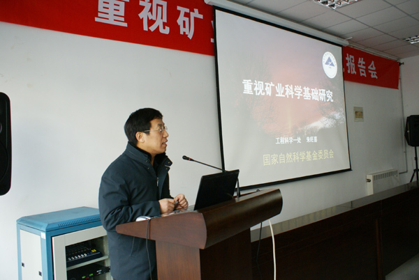朱旺喜处长首先简要介绍了国家自然科学基金委员会,指出基金委是我国资助基础研究最主要的机构,与基础研究有着密切联系。他说,矿业科学基础研究之所以不同于其它项目,在于它注重基础研究,重在探索,强调科学意义。因此要坚持尊重科学、发扬民主、提倡竞争、促进合作的工作方针。随后,朱处长列举了2009年国家自然科学基金委受理各类基金申请数据统计、2009年全国各地区国家基金批准项目情况、重点项目和面上项目负责人年龄分布、高校基金排序、全委自由申请项目分布、2009年工程与材料学部资助状况等,从上述方面概括了近年来国家自然科学基金委员会受理的申请及资助的状况。