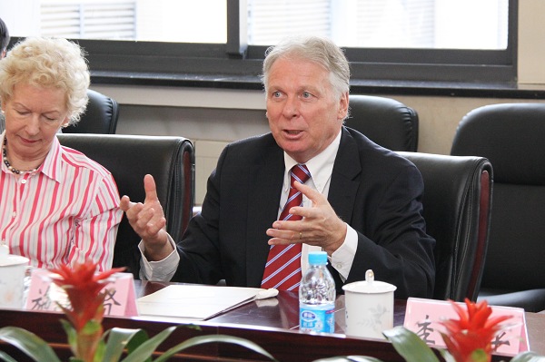 葛校长首先对大使一行的来访表示了热烈的欢迎,并就学校与中德中心的情况向大使做了详细汇报。葛校长说,中国矿业大学是中国唯一一所以矿业命名的教育部直属重点高校,在国际上是办学规模最大、办学实力最强、学科体系最齐全的矿业高等学府;经过百年的发展,学校已在学生培养、师资队伍建设、学科发展、科学研究等方面取得了卓越的成绩;同时,学校在国际交流方面也给予了充分的重视,现已与德国、美国、澳大利亚、英国、法国等国家的多所高校建立了密切的合作伙伴关系,尤其是在对德合作中,学校每年都派遣大量学生、教师赴德攻读学位或进行合作研究,每年也邀请德国高校或科研机构的专家学者来校进行合作科研、讲学与语言培训。