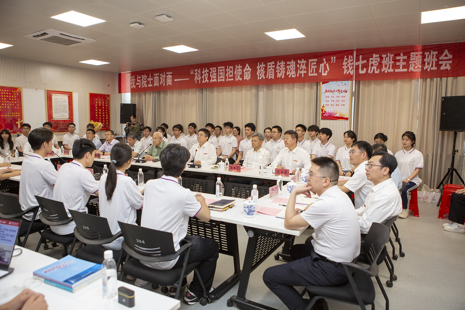 26日上午,两校“钱七虎班”联合举办“科技强国担使命,核盾铸魂淬匠心”主题班会。中国工程院院士钱七虎亲临班会,与两校师生共话科技报国强国与青年使命担当。东华理工大学党委书记张福庆主持班会。我校党委副书记蔡世华,东华理工大学校长罗仙平、副校长李满根出席班会。我校力学与土木工程学院和东华理工大学地球科学学院、核科学与工程学院、土木与建筑工程学院“钱七虎班”师生代表共同参加班会。