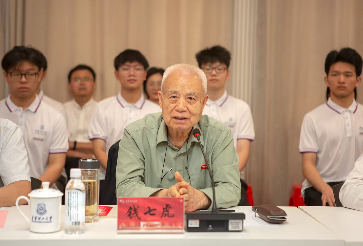 会上,两校“钱七虎班”学生代表分别汇报了班级建设情况与个人成长收获。钱七虎对同学们取得的成绩表示欣慰和赞赏。他指出,中国式现代化离不开土木工程、矿业工程、地质工程等重要学科,希望同学们要热爱所学专业、坚定成才信心。钱七虎结合自己投身国防科研事业的经历和古今中外伟人名人的事例,深情寄语同学们:一是要勤奋,要勤奋学习、勤奋工作;二是要创新,特别是注重原始创新,培养和提升批判性与颠覆性思维的能力;三是要主动学习和掌握“人工智能+”技术,培育和增强跨领域、跨学科素养,努力成长为复合型的拔尖创新人才。班会最后,钱七虎向学生代表签名赠书。