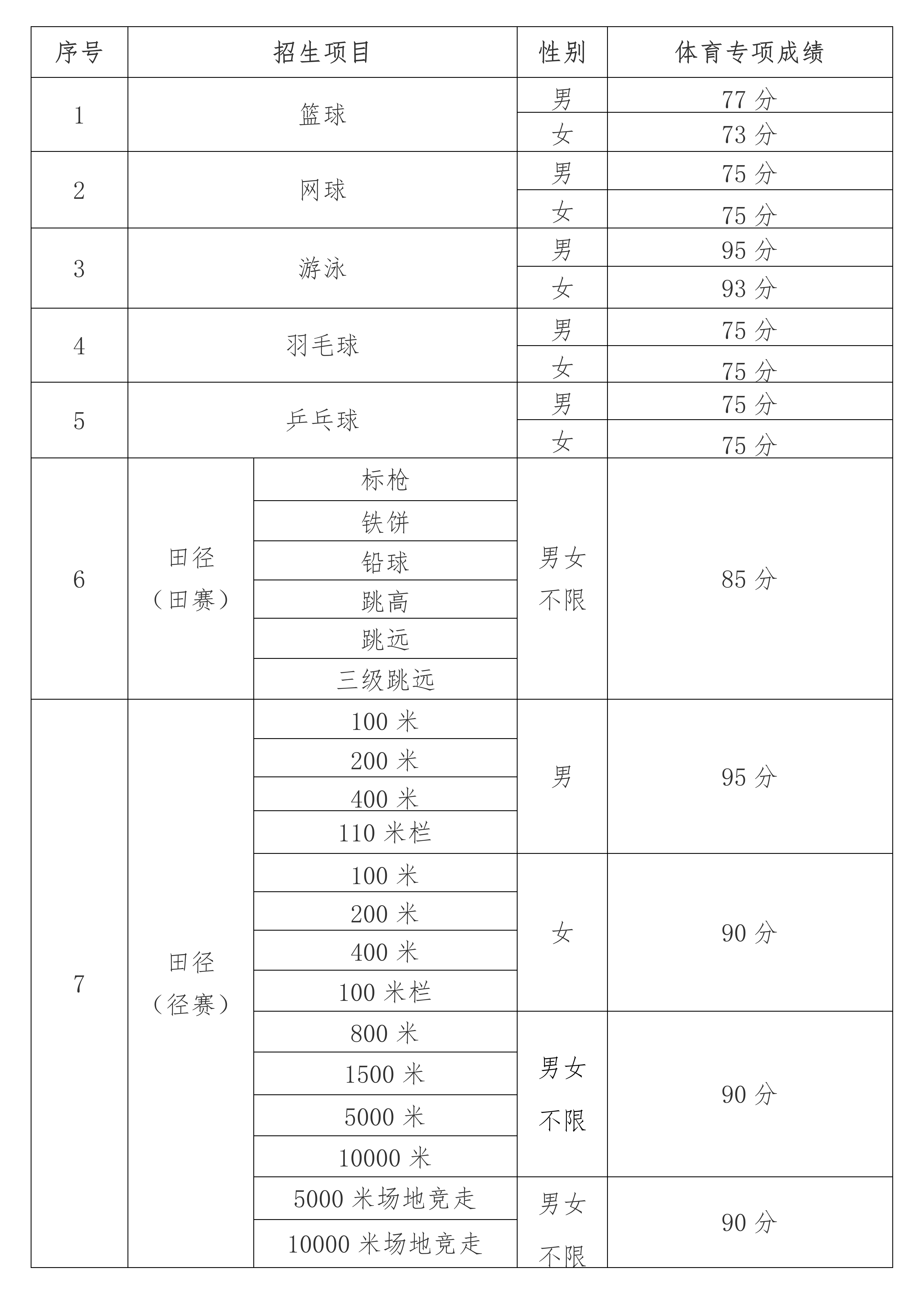 (二)体育专项成绩录取控制线