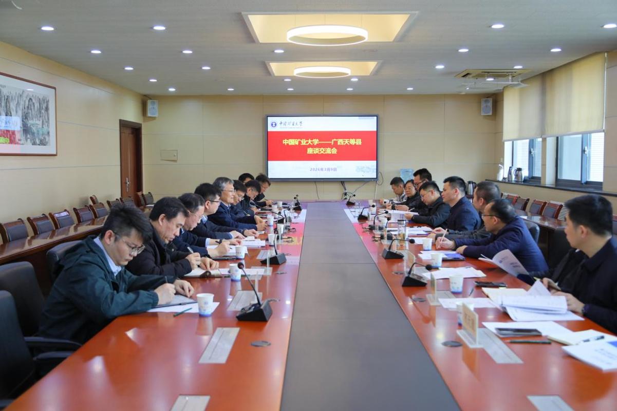 卞正富对欧正一行的到访表示热烈欢迎,并从人才培养、学科建设、师资队伍、科研创新等方面对学校整体情况进行了简要介绍。他表示,天等县拥有丰富的锰、铅锌等矿产资源,中国矿业大学在采矿工程、矿物加工工程、矿山生态修复等领域拥有世界领先的技术,可以为天等县矿产资源高效、安全、绿色开发提供人才与技术支持。他希望双方以此次交流为契机,建立常态化沟通机制,在绿色矿山建设、尾矿综合利用等领域开展务实合作,为助推天等经济社会高质量发展贡献“矿大智慧”和“矿大力量”。