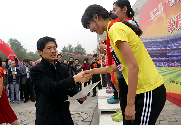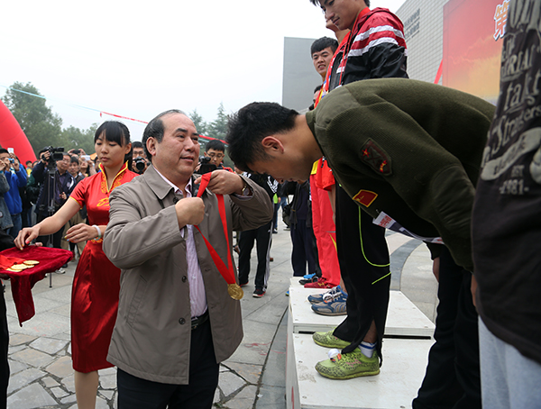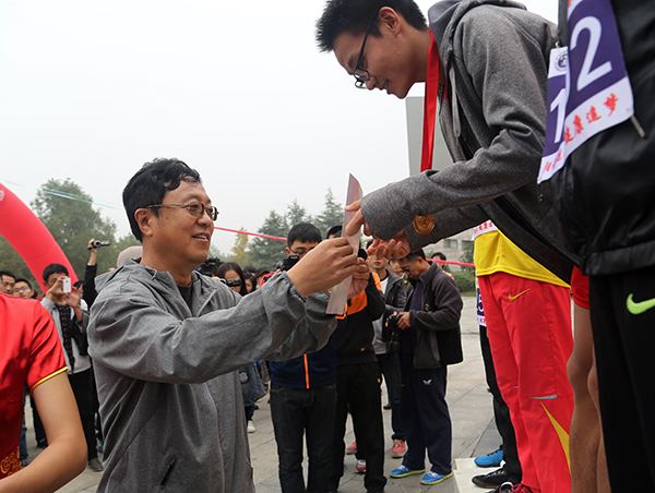 比赛结束后,邹放鸣书记、宋学锋副校长、曹德欣副书记为获得男子、女子前八名的同学颁奖,体育学院院长王朝军主持颁奖仪式。