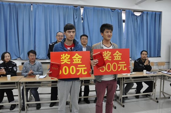 10月13日下午,市公安部门、校保卫处、学生工作处在计算机楼B210会议室召开专门会议,对安全学院2012级排黑尔丁同学和计算机学院2011级王同学抓获窃贼的见义勇为行为进行表彰。