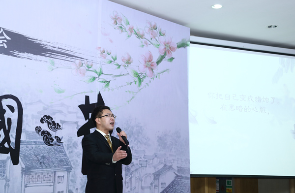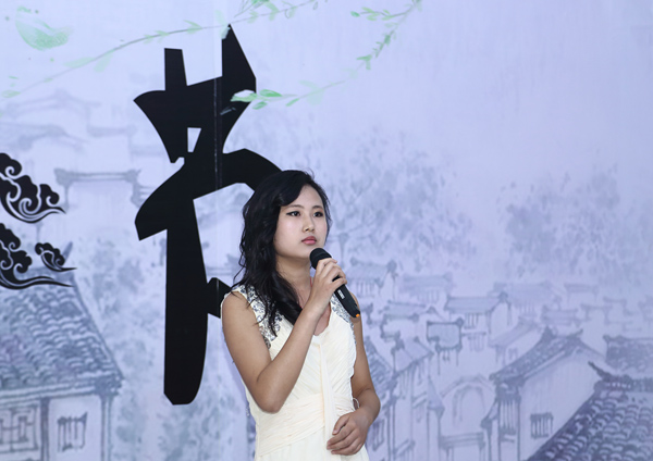 晚7:00,文法学院经典诵读班中语13-1班带来的《三字经》集体朗诵拉开了本届诗会的序幕。诗会共分为四个篇章,以“春夏秋冬”四季为线,分别围绕清明、端午、七夕、中秋、重阳和春节等中国传统节日展开,旨在通过朗诵的形式,加强全校师生对中国文化、中国节日和中国精神的重视与赓续,进而推动社会主义核心价值观在全校上下的普及和践行。在第一篇章“春雨翩跹,素手临卷”中,诗文《感悟清明》情感真挚,寄托了清明时节慎终追远的哀思;《清明悠游赋》文辞优美,描绘了在天地一片清新明朗之际外出游玩的悠然自得;诗歌《秋瑾》则生动再现了爱国烈士“抛头颅,洒热血”,在敌人面前无所畏惧、信仰坚定的精神品格。在第二篇章“夏日悠游,望江吟咏”中,《遥忆屈原》、《端午思念屈原》等诗篇,带领现场观众回顾了爱国诗人屈原当年“举世皆浊我独清,众人皆醉我独醒”的高风亮节,也在端午佳节来临之际向全校师生带来节日的问候;《望七夕》、《我们的纪念》再现了牛郎织女间的唯美爱情,表达了对矢志不渝坚守爱情的赞美与歌颂。在以“秋月皎皎,执手相唱”为主题的第三篇章中,《中秋月色》、《秋月赋》、《仲尼》和《饮九月初九的酒》等作品流露着浓浓的秋意和深深的秋思,让与会师生联想到了月到圆时思人思乡之感和重阳之际登高望远之情。在第四篇章“冬夜对酌,为伊而歌”中,诗篇《春节诗串烧》谱写了一曲素雅的冬日颂歌,展现了千百年来“春节”给中华民族带来的节日喜庆与团圆幸福。