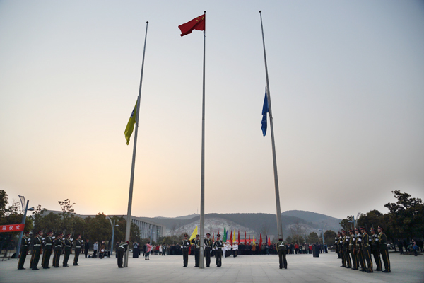 上午7:00,在云峰大学生管乐团演奏的激昂的《歌唱祖国》的乐曲声中,国旗护卫队护卫国旗健步进入升旗区。在雄壮的《国歌》声中,五星红旗冉冉升起。随后,中国矿业大学校旗在《中国矿业大学校歌》悠扬的旋律中升起在国旗广场上空。