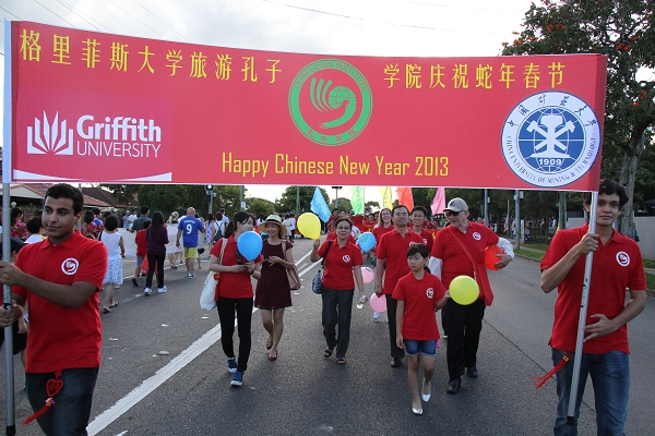 2月23日中国正月十四,旅游孔子学院与布里斯班中国节组委会的其他华人社团通力合作,共同筹划,成功举办了蛇年2013布里斯班中国节活动。当日在布里斯班举办盛大的春节游行,游行队伍由骑警护驾,名车开道,一路上狮舞龙飞,热闹非凡。游行活动后举办了千人祈福活动,晚上的布里斯班华人春节晚会汇集了社区群众的文艺演出,并邀请了山东济南杂技团友情演出。应邀出席春节游行祈福活动和晚会的有澳大利亚联邦政府、昆士兰州、布里斯班市政府及各界代表和知名人士。