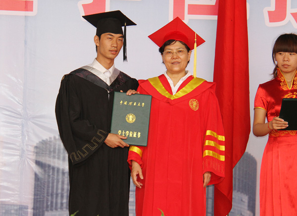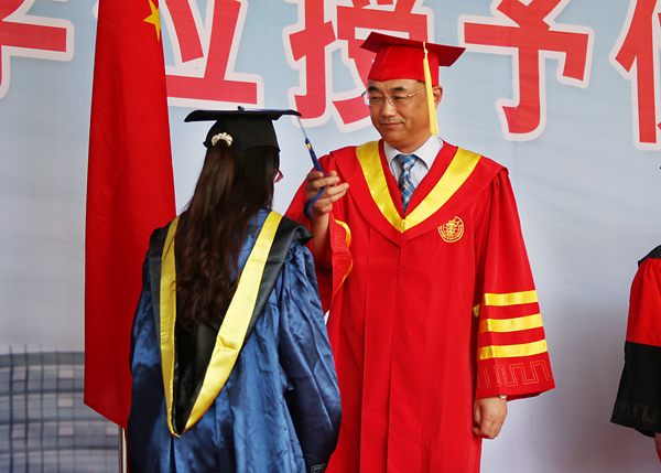 伴随着欢快的乐曲,每一位被授予学位的毕业生陆续走上典礼台,趋前向领导行鞠躬礼,身穿鲜红色导师袍的院领导与学生亲切握手,并为他们拨正流苏。随后,学校领导或校学术委员会领导与学生一一握手,并亲手为每一位学生颁发学位证书,送上临别赠言。在此过程中,校领导、校学术委员会领导和院领导与每一位毕业生合影留念。