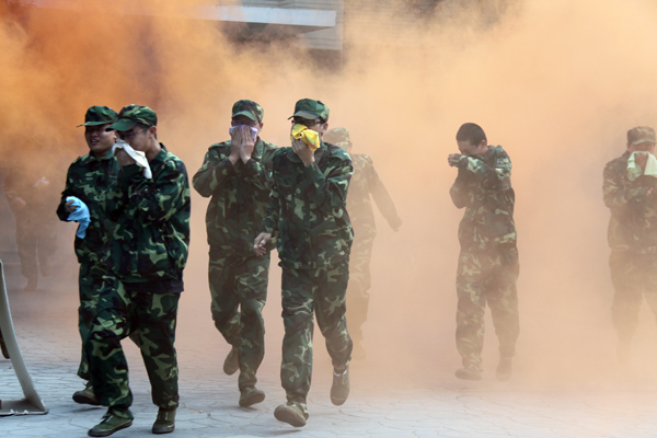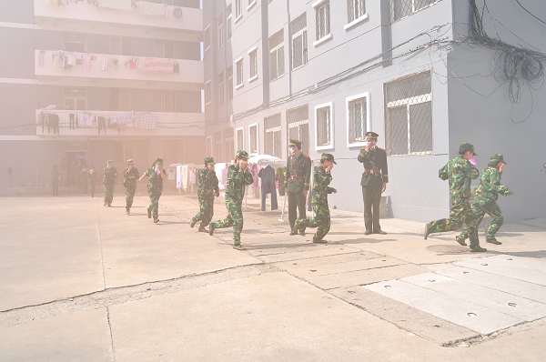 本次演习,模拟学生宿舍楼突发火灾,警报响起后,学生们用毛巾捂住口、鼻,按照疏散指示灯所示方向迅速有序地向楼外安全区域疏散,参加演习的学生在五分钟内便有序地疏散到安全区域。