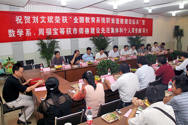 9月16日下午,中国矿业大学在文昌校区校工会二层会议室召开庆祝刘文斌荣获“全国教育系统职业道德建设标兵”暨数学系、周福宝等获市师德建设先进集体和个人荣誉座谈会。校党委副书记、纪委书记曹德欣,校长助理、校工会主席刘圣汉出席座谈会。校党政办、组织部、宣传部、人事处、教务处、学工处、妇委会、校团委有关负责人及获奖单位党政领导、部分教师、工会干部代表参加了座谈会。座谈会由校长助理、校工会主席刘圣汉主持。