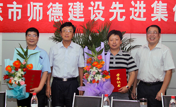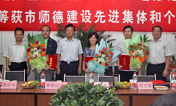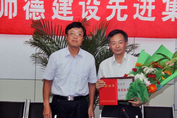 校党委副书记、纪委书记曹德欣为市“师德建设先进集体”颁发证书